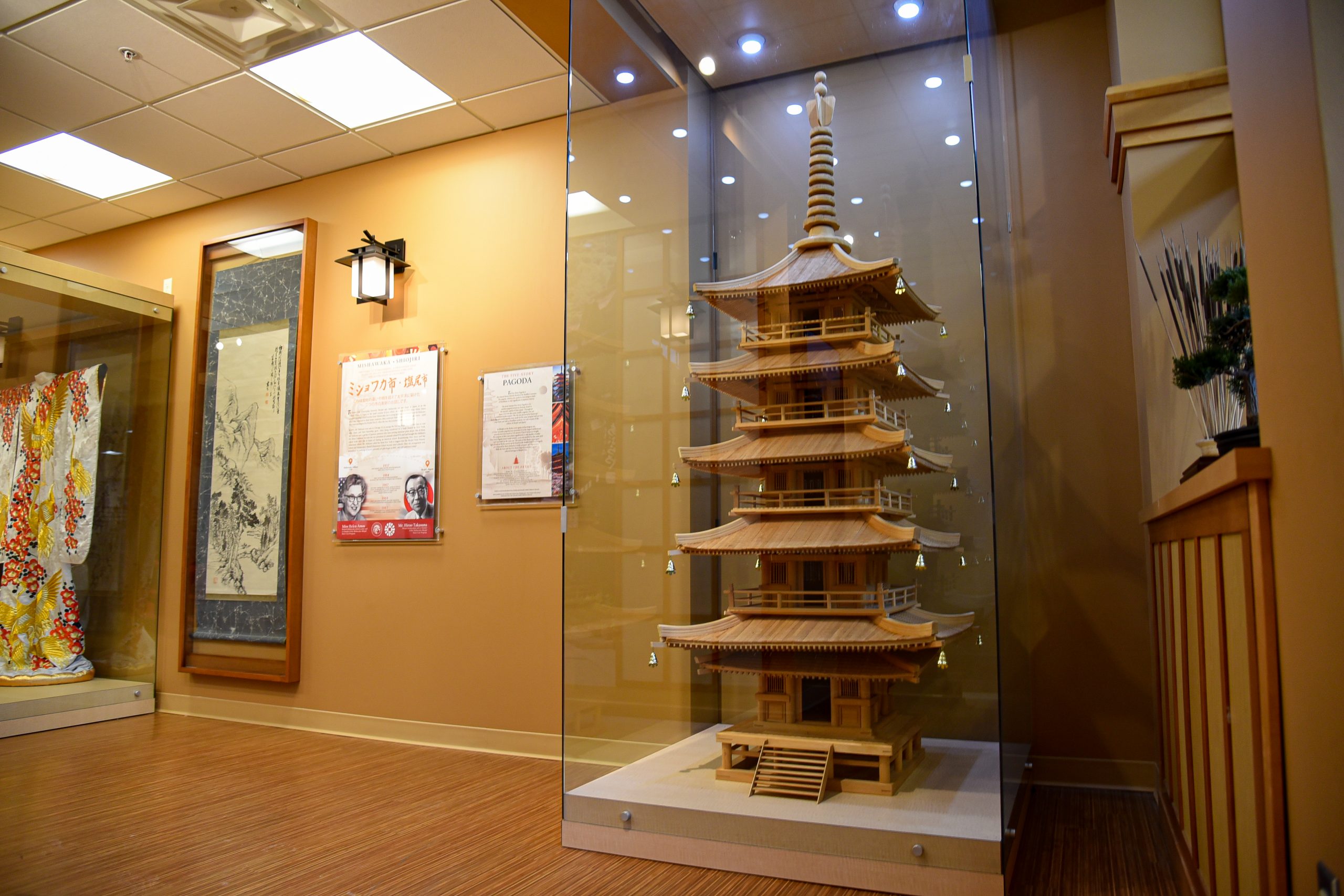 In another case rises the model of a five-story pagoda that artist Shigehisa Komatsu took 2½ years to craft out of wood.