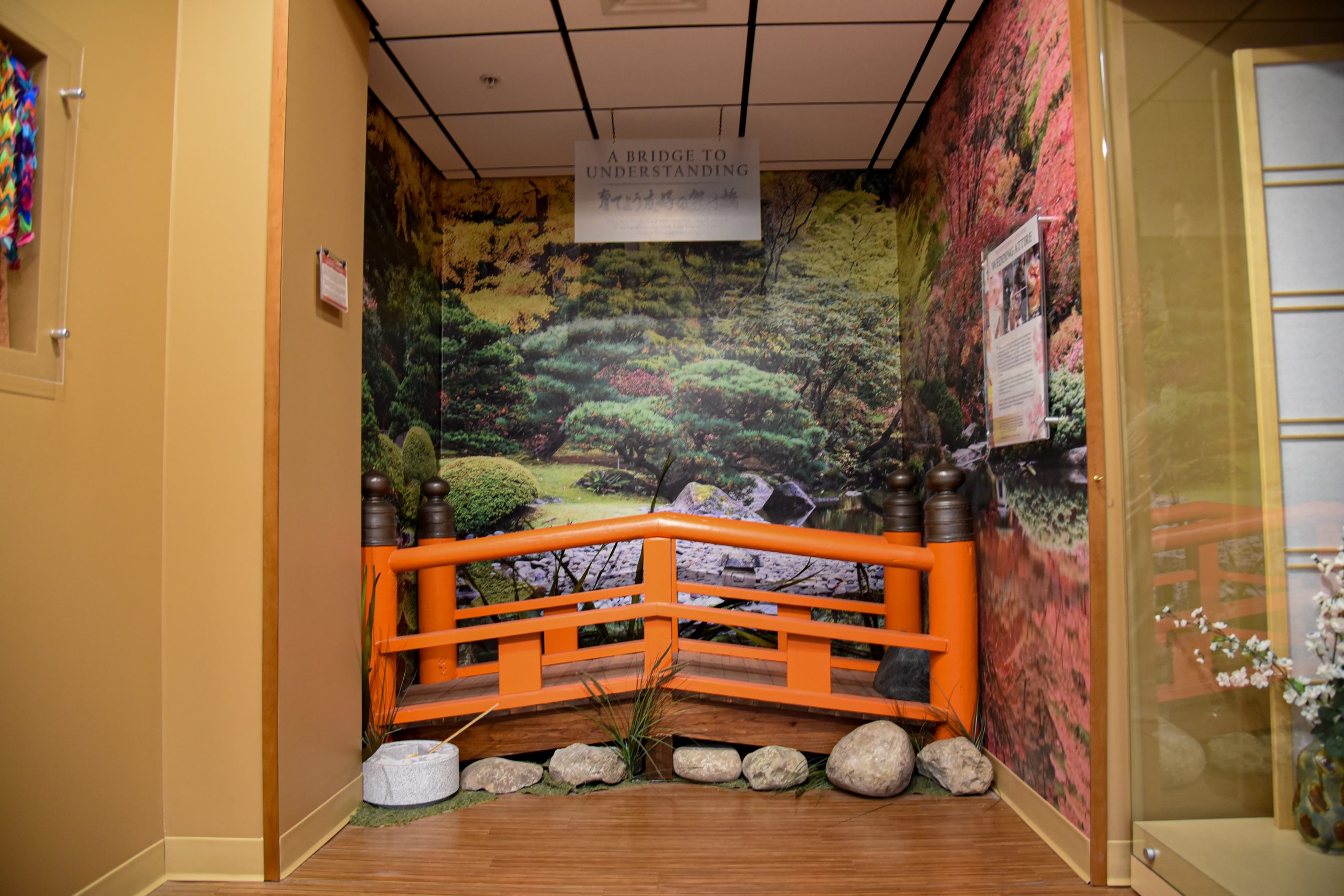 Under the sign “A bridge to understanding,” a local craftsman built a footbridge to mimic the bridge at Shiojiri Niwa, the 1.3-acre Japanese garden next to Mishawaka’s Crawford Park. This bridge is painted orange because many traditional footbridges in Japan are also orange.