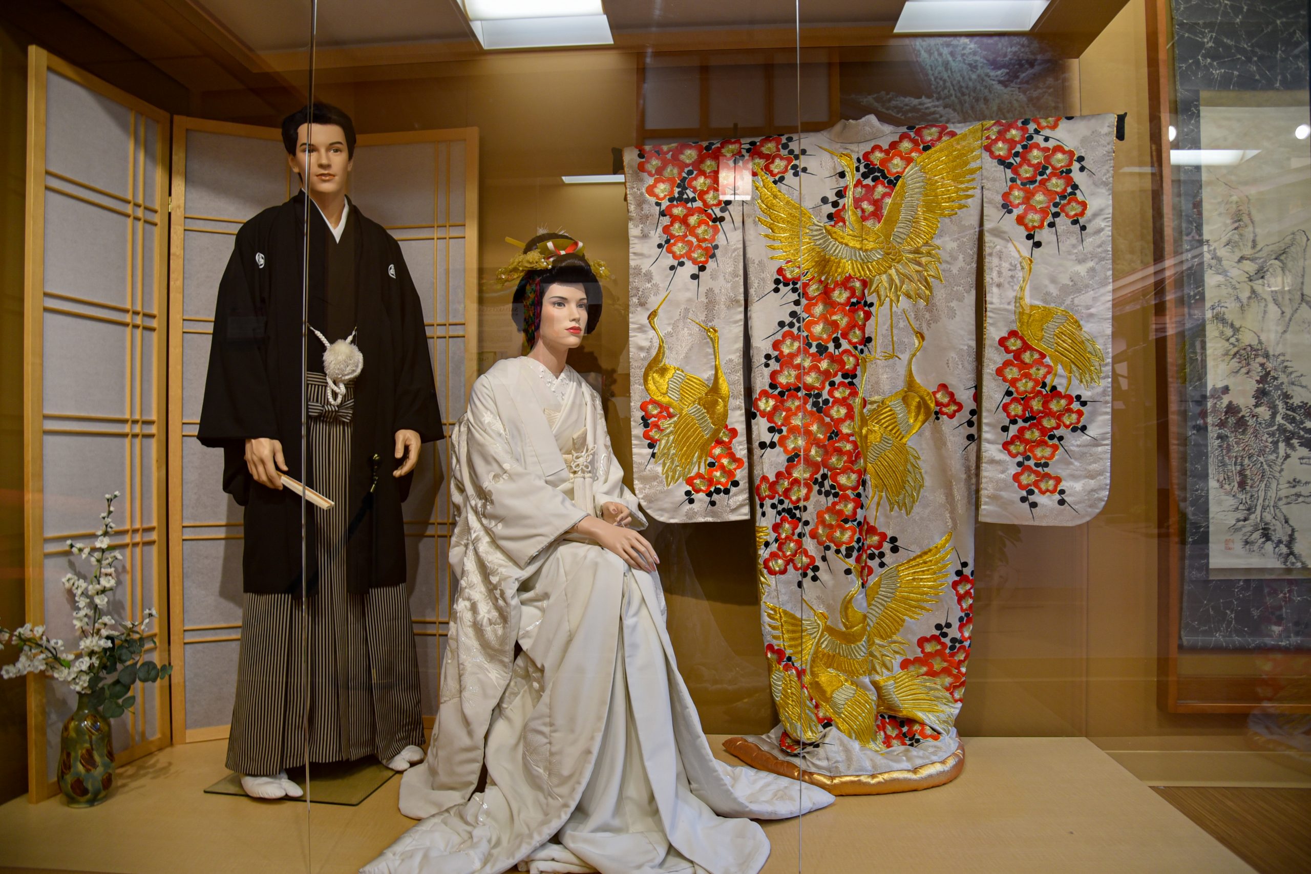 In a glass case, two mannequins wear traditional Japanese wedding garb modeled after one of the many people who have flown between Mishawaka and Shiojiri since their residents started exchanging gifts and letters in 1964. A placard shows photos and tells of the wedding of Ritsuko Osaki, a woman who graduated from Mishawaka High School in 1985 as an exchange student.